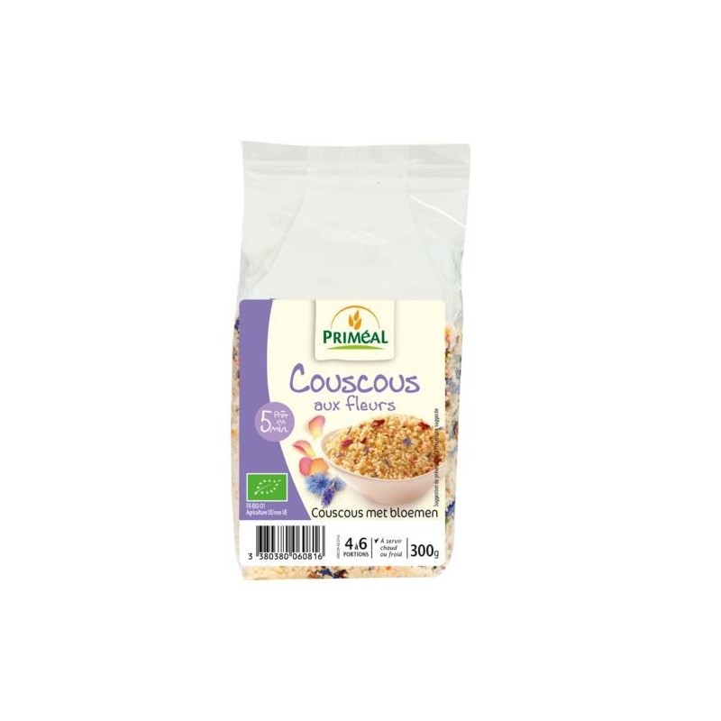 Semoule blanche de blé dur*, flocons de pois chiche*, sel marin, carotte*, fleurs*(1 %) ( hibiscus*, rose de Damas*, bleuet*, lavande*), paillettes d’huiles essentielles* (agave*, huiles essentielles d’agrumes*), oignon*, persil*, ail des ours*, ail*, romarin*, curcuma*.